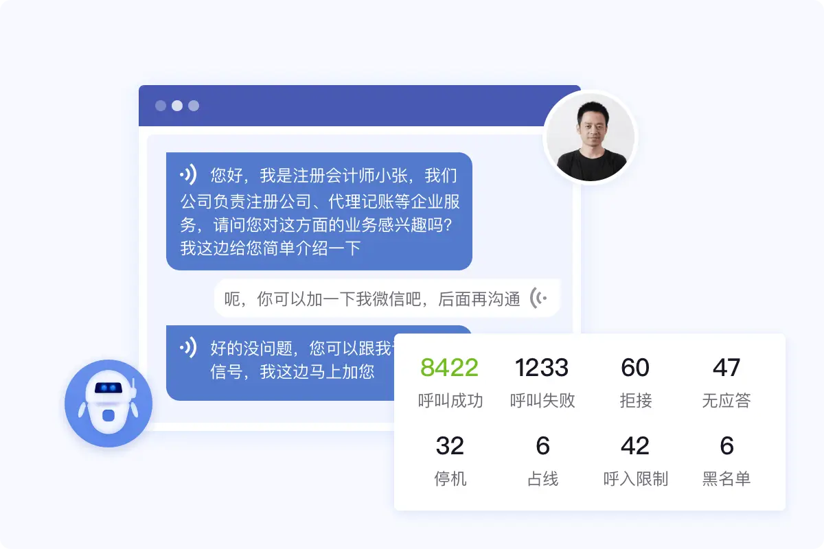 外呼机器人持续自动拨号,跟进记录同步上传,每天维持800~1200通电话量,365天无休~