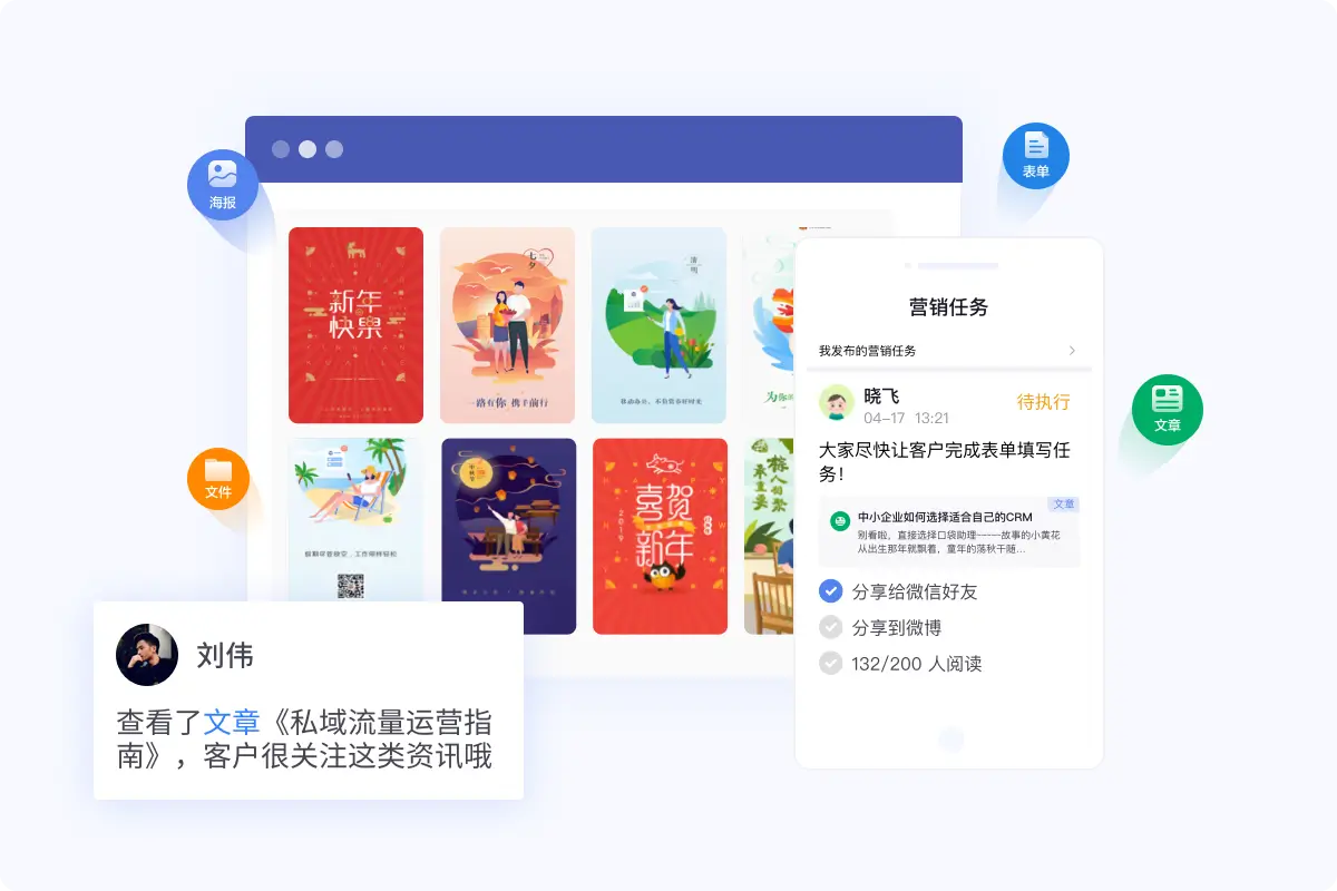 提供海量海报模板、热点资讯、营销表单、个人名片和微官网,为社交获客提供内容支撑