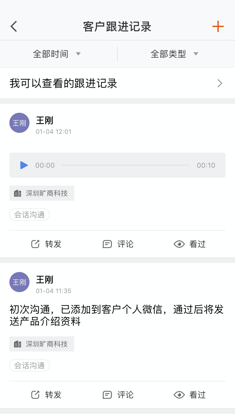 会话沟通、外勤拜访,不同跟进类型一目了然,销售跟进过程实时掌握