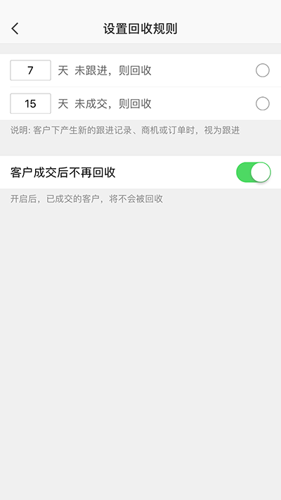 未跟进或未成交的客户自动回收,或是成交后不再回收