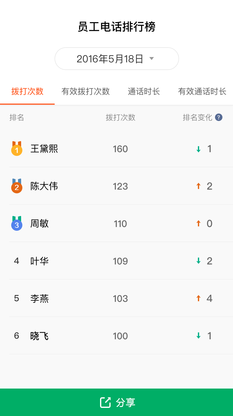 不同类型的排行榜,展示员工话务成绩的排名和变化,带来团队竞争氛围